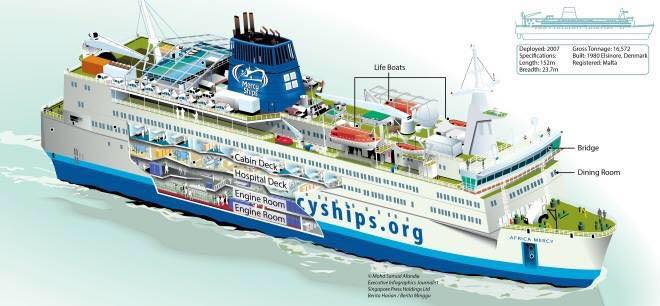 Global Mercy har 6 operationssalar, över 200 vårdplatser och 600 besättningsmän kan bo och arbeta på skeppet. Det kommer att åka till Afrika under våren 2022, men först måsten den utrustas och kommer att står i Europa fram tills dess. Vill du veta mer, kontakta Mercy Ships Sverige