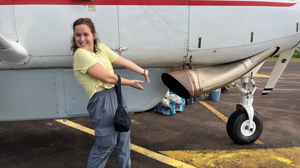 Teamet gick rakt igenom flygplatsen utan att visa upp varken biljett eller ID. Vi bar alla väskor genom byggnaden direkt till flygplanet och där började pilotens hårda arbete med att räkna hur mycket vi kunde ta med, förutom oss passagerare. Det var nu viktigt att vi fördelade vikten i flygplanet.